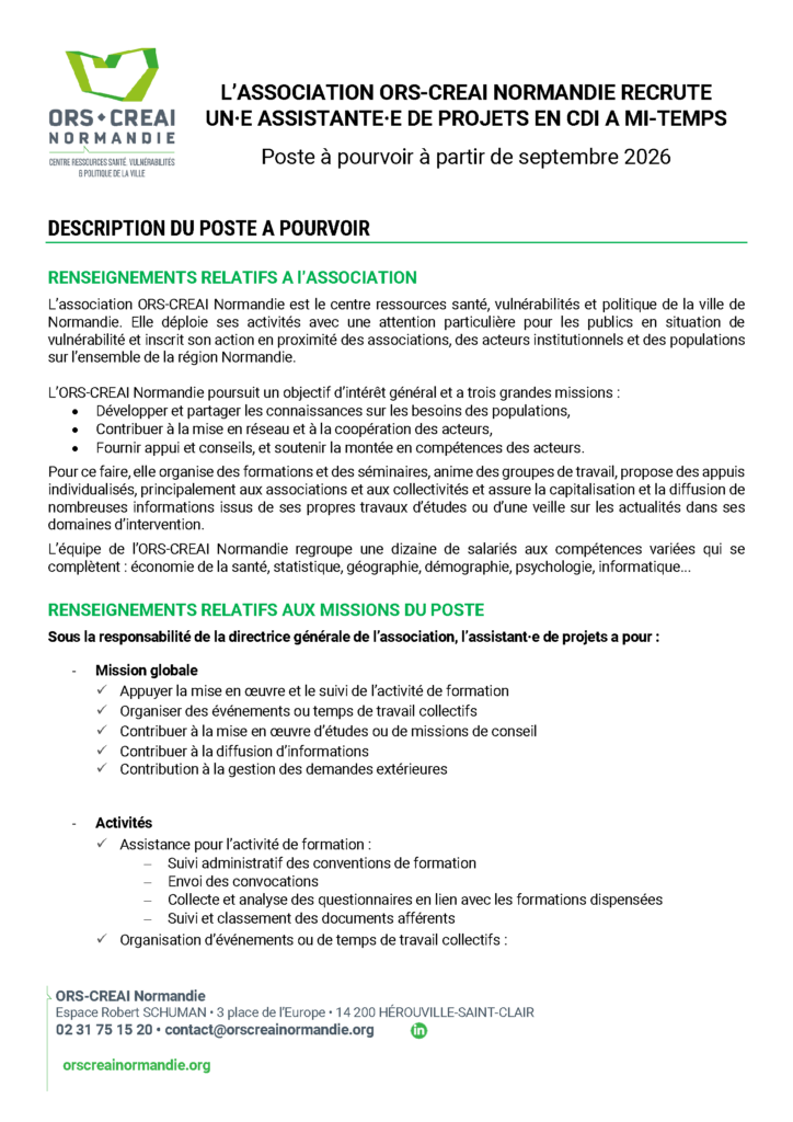 Les candidatures peuvent être adressées jusqu’au 31 mai 2026 par mail : f.grare@orscreainormandie.org