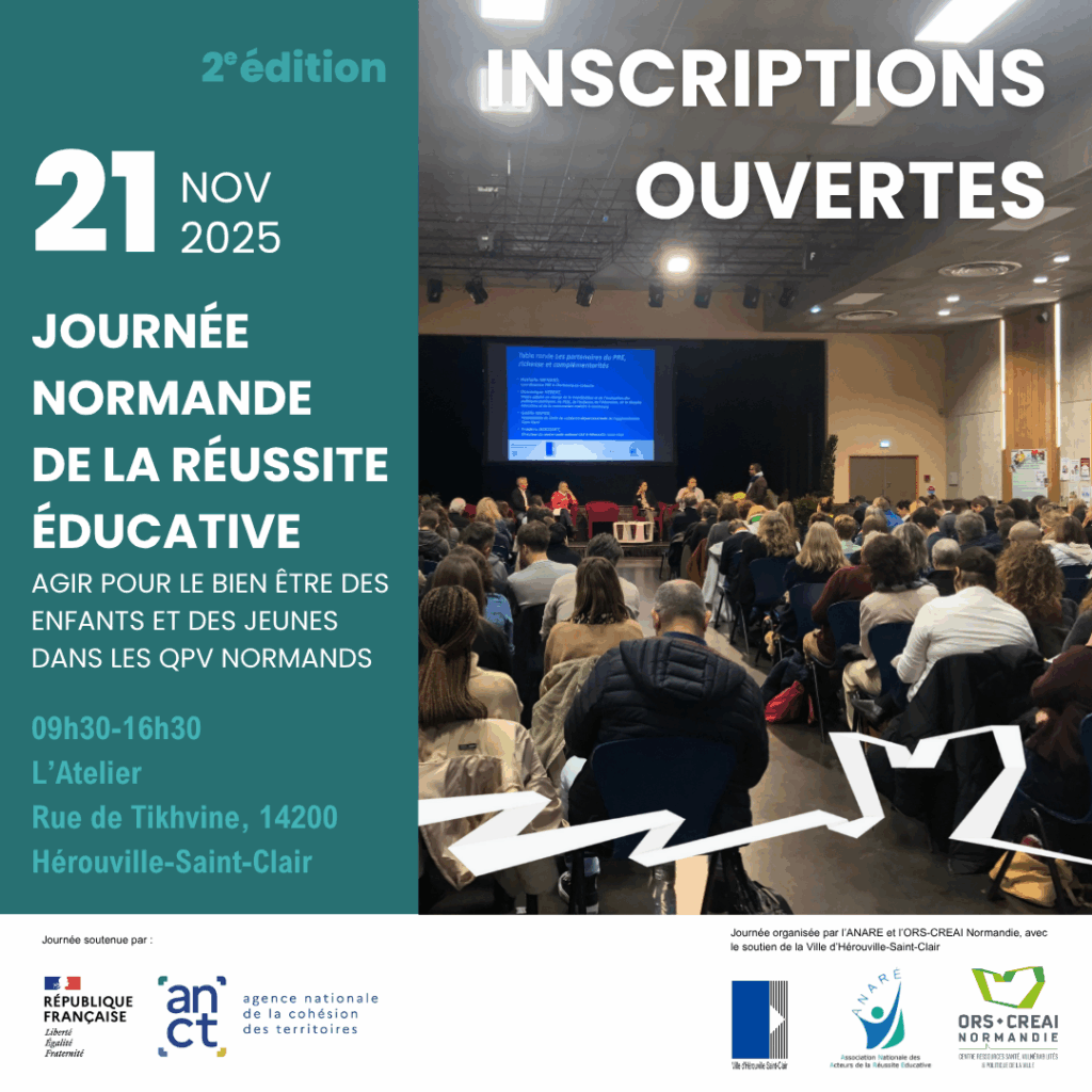 L’ANARE et l’ORS-CREAI Normandie, avec le soutien de la Ville d’Hérouville-Saint-Clair, ont le plaisir de vous convier à la 2ᵉ édition de la Journée normande de la réussite éducative. Cette rencontre portera sur un enjeu central : agir pour le bien-être des enfants et des jeunes dans les QPV normands.
