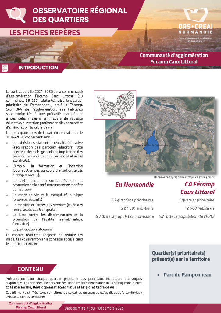 Afin d’outiller les acteurs œuvrant auprès des habitants des quartiers prioritaires de la politique de la ville, l’ORS-CREAI Normandie met à votre disposition les « Fiches repères » et les « Fiches mise en lumière » de l’Observatoire régional des quartiers (ORDQ). Ces documents, réalisés avec le soutien de l’Agence nationale de la cohésion des territoires et de l’Agence Régionale de Santé de Normandie, ont vocation à être régulièrement complétés et actualisés.